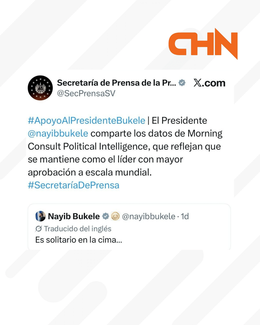 En el plano interno, los números también son contundentes. Una encuesta de CID Gallup, realizada en marzo de 2026, refleja niveles históricos de respaldo, con un 94 % de aprobación entre los salvadoreños.