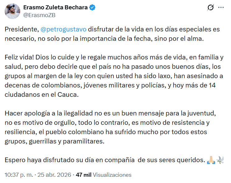 La reacción no se hizo esperar. Desde Córdoba, Zuleta lanzó un mensaje directo: cuestionó el momento del pronunciamiento y advirtió que mientras se hablaba de celebraciones, Colombia atravesaba días marcados por la violencia y el dolor.