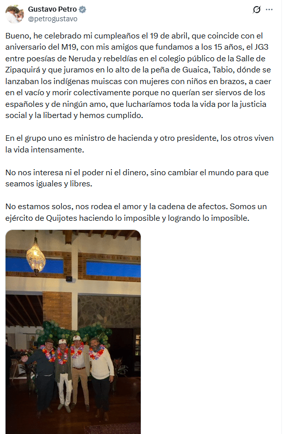 Todo estalló por un trino publicado la noche del 25 de abril, en el que el presidente evocó la celebración de su cumpleaños —que coincide con el aniversario del M-19— y habló de su juventud, sus ideales y su lucha por “cambiar el mundo”.