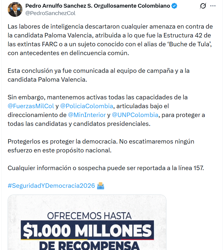 La polémica está servida. El ministro de Defensa, Pedro Sánchez, aseguró que no existe evidencia de un plan para atentar contra la candidata presidencial Paloma Valencia, pese a que días atrás la propia aspirante había encendido las alarmas con una denuncia pública.