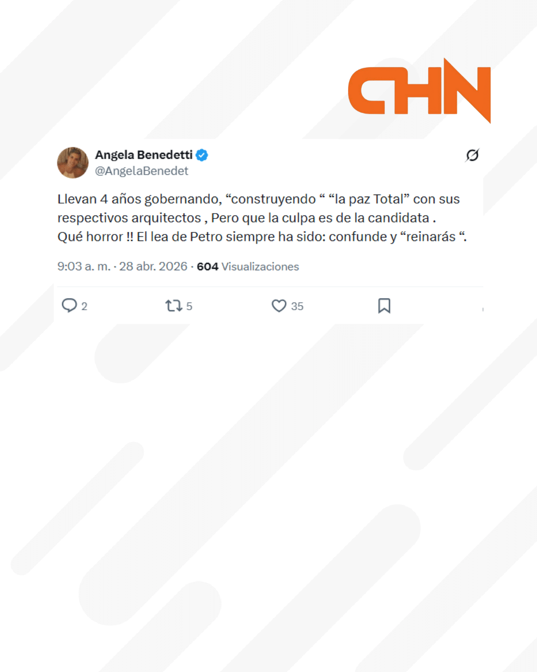 El movimiento no es menor. Ángela Benedetti había respaldado en 2022 a Gustavo Petro, y su cambio de postura hoy abre preguntas sobre fracturas en sectores cercanos al Gobierno. Más que un apoyo aislado, su pronunciamiento mete presión en la campaña y agita el tablero político en un momento clave.