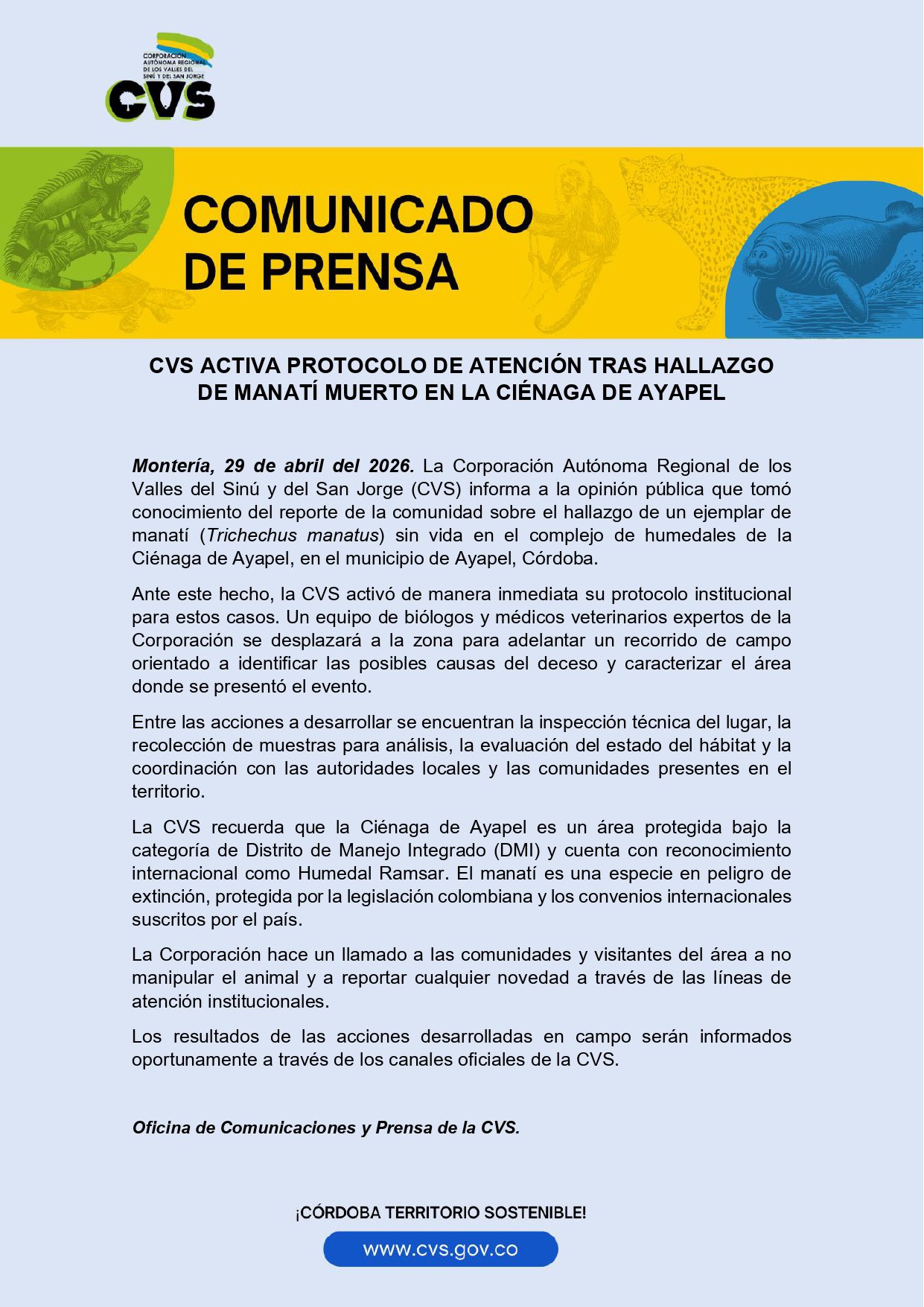 La preocupación crece en Ayapel. Un manatí apareció sin vida en plena Ciénaga, una de las zonas más sensibles del ecosistema en Córdoba, encendiendo las alertas entre comunidades y autoridades.
