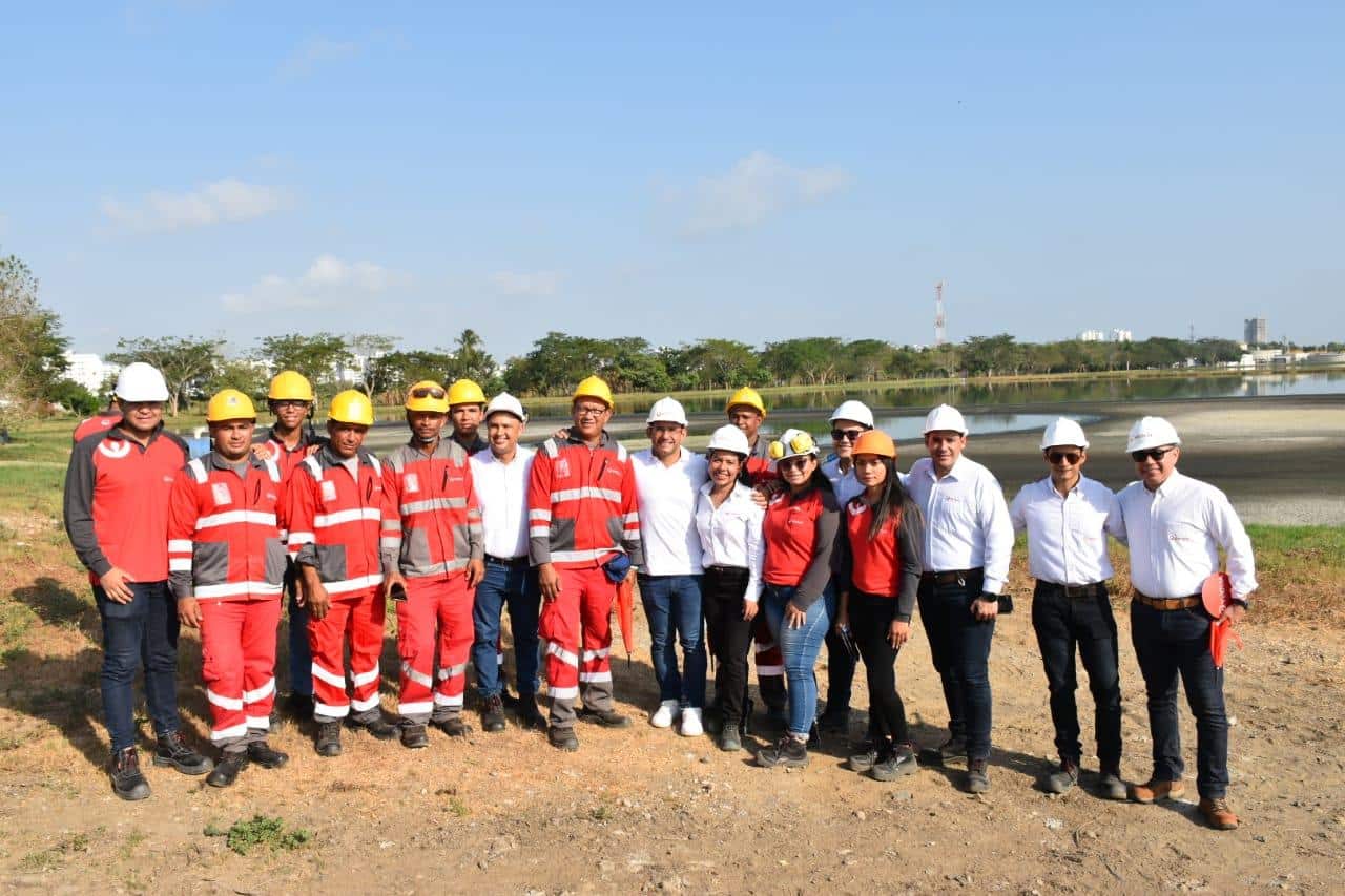El gerente de operaciones de Veolia Montería, Miguel Hernández, junto al jefe de alcantarillado, Álvaro Bonfante, y el equipo de…